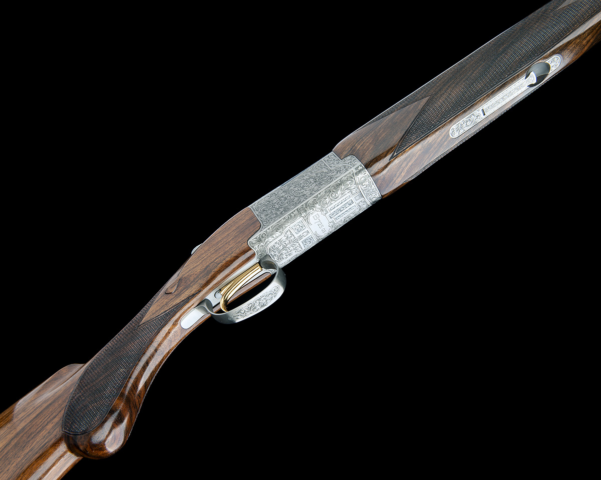 32in. nitro barrels with 6mm ventilated matt top-rib, 3in. chambers, multichokes (with spares), hold-open toplever, manual safety with integral barrel selector switch, gold-washed single trigger, acanthus scroll engraving set against a matt background, the underside with the model designation, 14 7/8in. semi-pistolgrip stock including 3/4in. rubber recoil pad, weight 6lb. 9oz., in its makers universal case