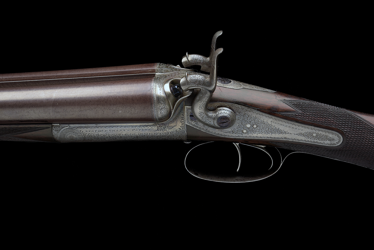 for 1875, 30in. nitro reproved (2021) fine damascus barrels, the rib engraved 'STEPHEN GRANT 67A ST. JAMES'S STREET LONDON', and '1', 2 3/4in. chambers, bored approx. true cyl. in both, E.C. Hodges patent action, patent no. 251 of January 31 1871, use number 839, carved percussion fences, rebounding back-action locks, border and fine acanthus scroll engraving, the standing breech with an oval engraved 'PATENT', the action bar with 'STEPHEN GRANT'S PATENT', retaining very slight traces of original colour-hardening, 14 5/8in. well-figured stock including wooden buttplate with engraved steel heel and toe plates, weight 6lb. 13oz.