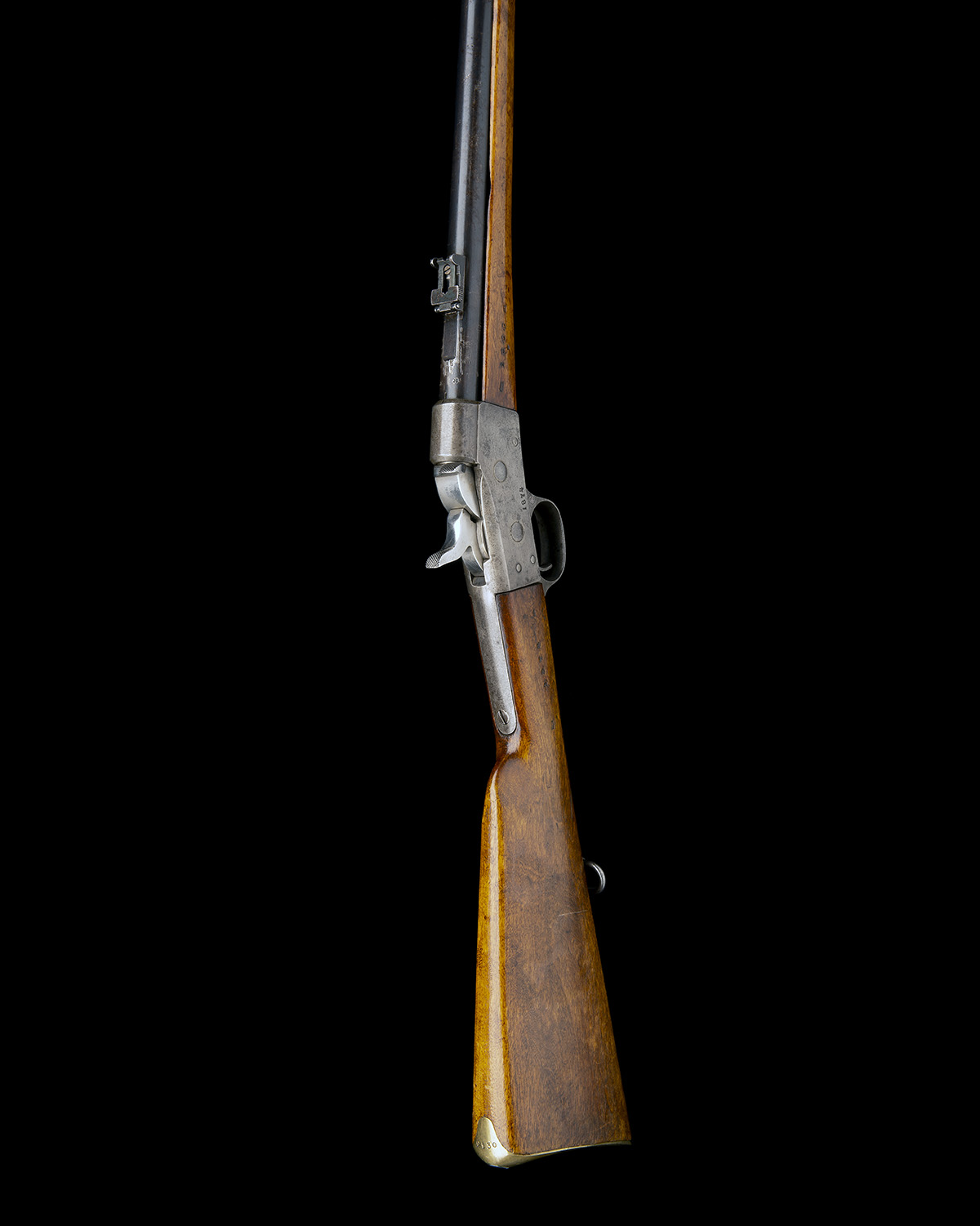 dated for 1874, with blued round 18in. barrel, applied fore-sight blade, small elevating ladder rear-sight, colour hardened rolling block action of Remington type, pale hardwood butt-stock with vacant identity disk set into the left hand side, brass heel-plate, splinter hard-wood fore-end with single barrel-band and replacement iron clearing rod