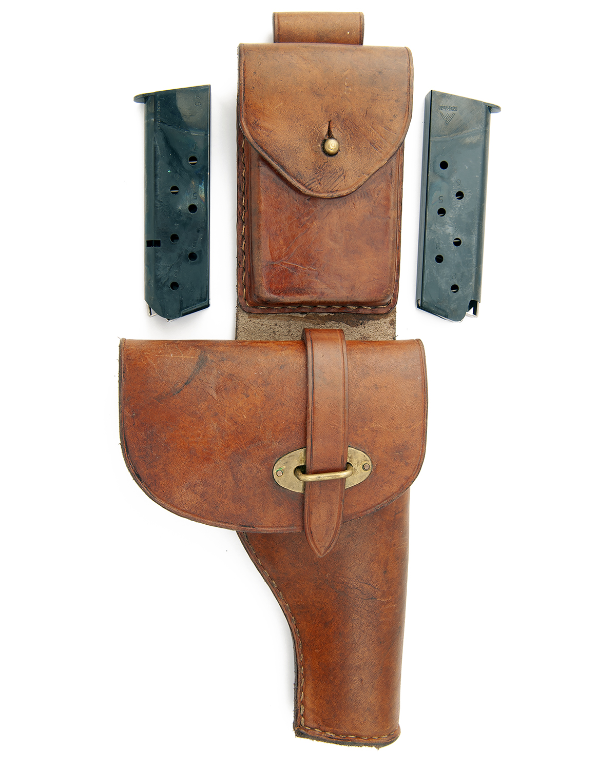circa 1935-40, with blued sighted slide with distinctive finger grooves, brushed bright barrel, blued frame, exposed hammer and vertical ribbed wood grips, reblued finish, complete with its leather full-flap service holster with magazine pouch combined, and including two spare magazine