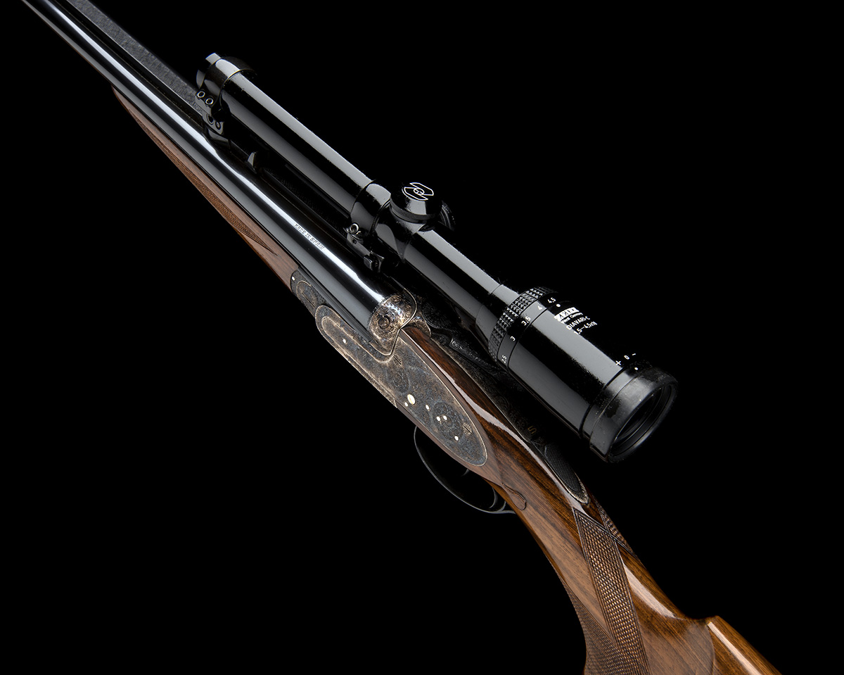 23 3/4in. nitro chopperlump barrels (dated to 1978) with solid raised matt rib, open sights and ramped bead fore-sight, the breech end mounted with a Zeiss Diavari-C 1,5...4,5x18 telescopic sight, serial no. 202065, in quickly-detachable mounts, treble-grip action with hidden third bite, removable striker discs, engine turned action flats, automatic safety, gold-inlaid cocking-indicators, articulated front trigger, acanthus scroll engraving with floral bouquets, retaining much original colour-hardening and finish, 14 3/8in. pistolgrip stock with cheekpiece and including 1in. ventilated rubber recoil pad, weight 8lb. 9oz. (unscoped) and 9lb. 11oz. (with scope)