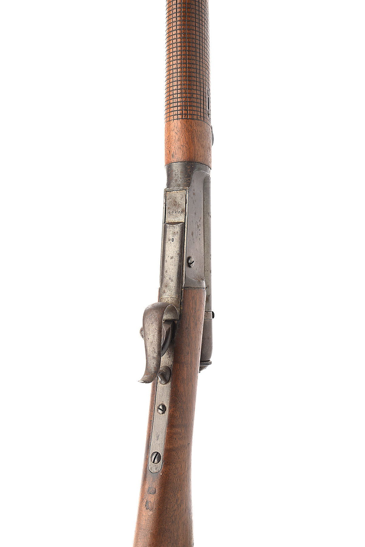 with 33in. barrel fitted with block and blade front-sight and quadrant rear-sight, the action stamped "SOC. IND, SUISSE / SYSTEM VETTERLIN", two piece iron mounted full walnut stock the forend with square cut chequering and three barrel bands, rod missing. The barrel and action with some original blue finish balance to a plum brown patina, action at fault.