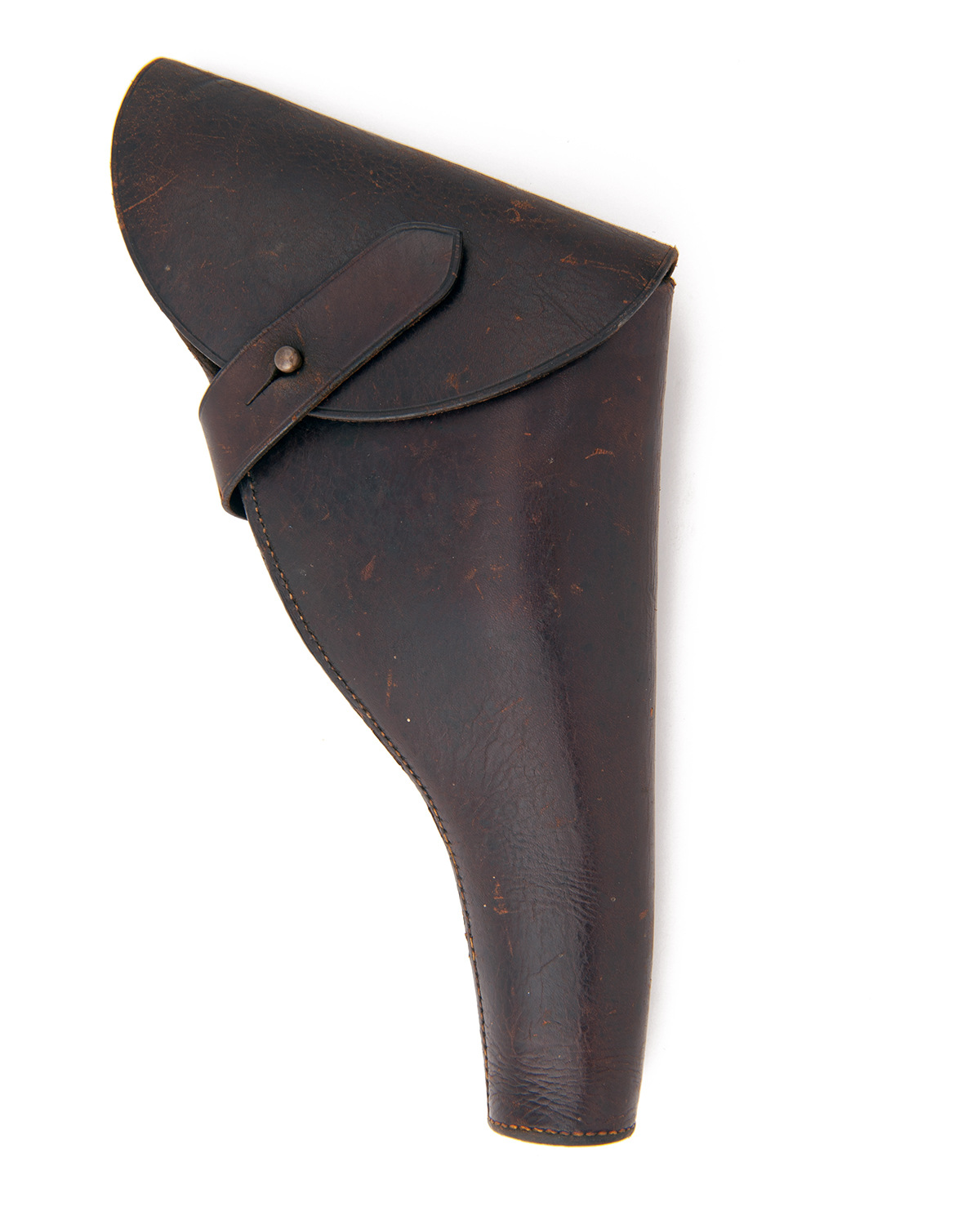 dated for 1918, with blued 6in. barrel, ramp fore-sight, rear-sight notch to barrel latch, break-open frame with automatic ejecting fluted cylinder, blacked ancillaries, double action mechanism and chequered hard rubber grips with lanyard ring at heel, much original finish remaining, complete with a leather full-flap service holster.