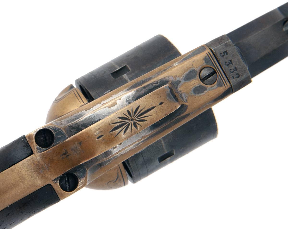 circa 1862, with blued octagonal 4in. barrel, the top-flat signed 'D. MOORE PATENT, SEPT 18 1860', blued cylinder engraved with three lines around the circumference and marked with patent dates, florally engraved open brass frame (traces of silver plate), engraved grip-straps and trigger guard, smooth walnut grips and detachable under-barrel ejector rod, the whole retaining a fair amount of original finish