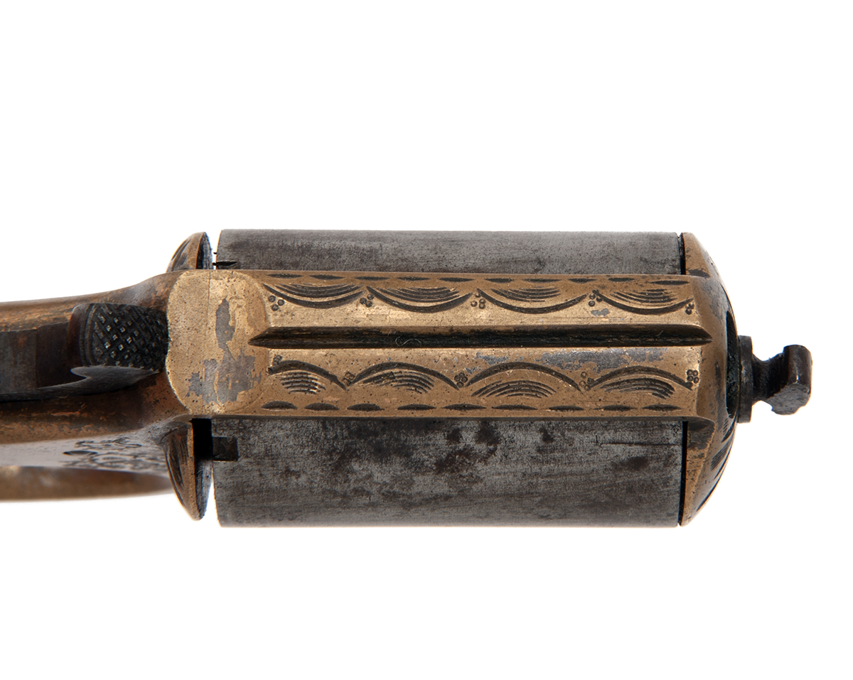 made between 1869-1884, with plain iron 1 5/8in. five-shot cylinder forming the barrel-group, brass frame with scroll engraved grip and engraved face-plate with bullet apeture, chequered shield shaped panel to back-strap, finger aperture behind trigger, iron central hammer and slight traces of blued and plated finish