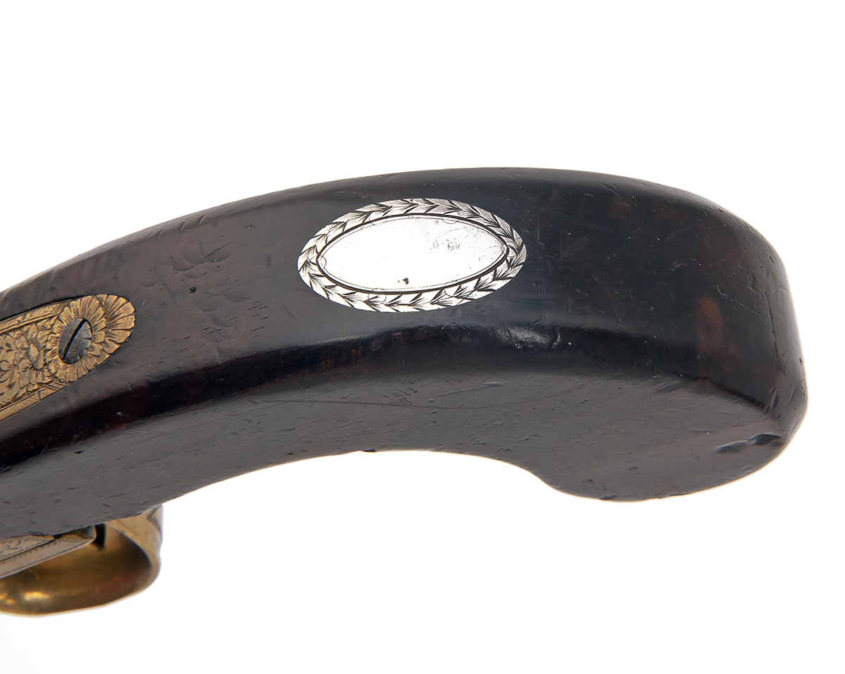 circa 1795 with later conversion to percussion, with 6in. octagonal barrel, applied white metal blade fore-sight, centrally mounted nipple on the remnants of the pan, squared boxlock action engraved with borders and martial trophies signed in central ovals 'JOVER & SON' on the left and 'LONDON' on the right, border engraved top-plate with integral tang and central hammer, walnut slab-sided butt (small losses at head), sliding brass trigger-guard safe and applied brass under-rib with plain thimbles for the brass tipped iron ramrod