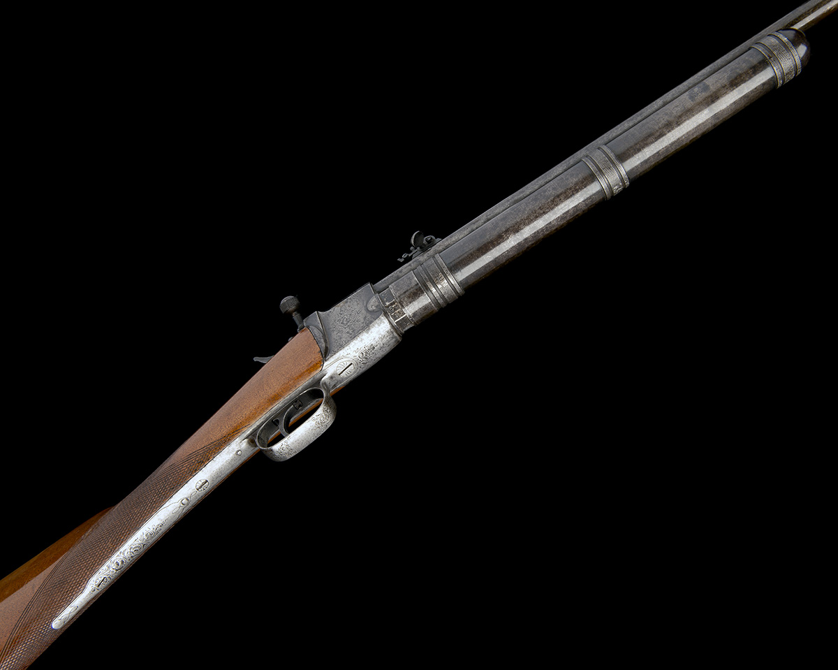 circa 1895, with round 25in. barrel signed by the maker, dove-tailed blade fore-sight, elevating tangent rear-sight, scroll engraved slab-sided receiver with rotating loading tap for ball and external hammer, detachable reservoir under the barrel (numbered 19406), chequered walnut straight-hand butt-stock with ribbed hard rubber heel-plate (small chip), guarded adjustable trigger, traces only of original blued finish