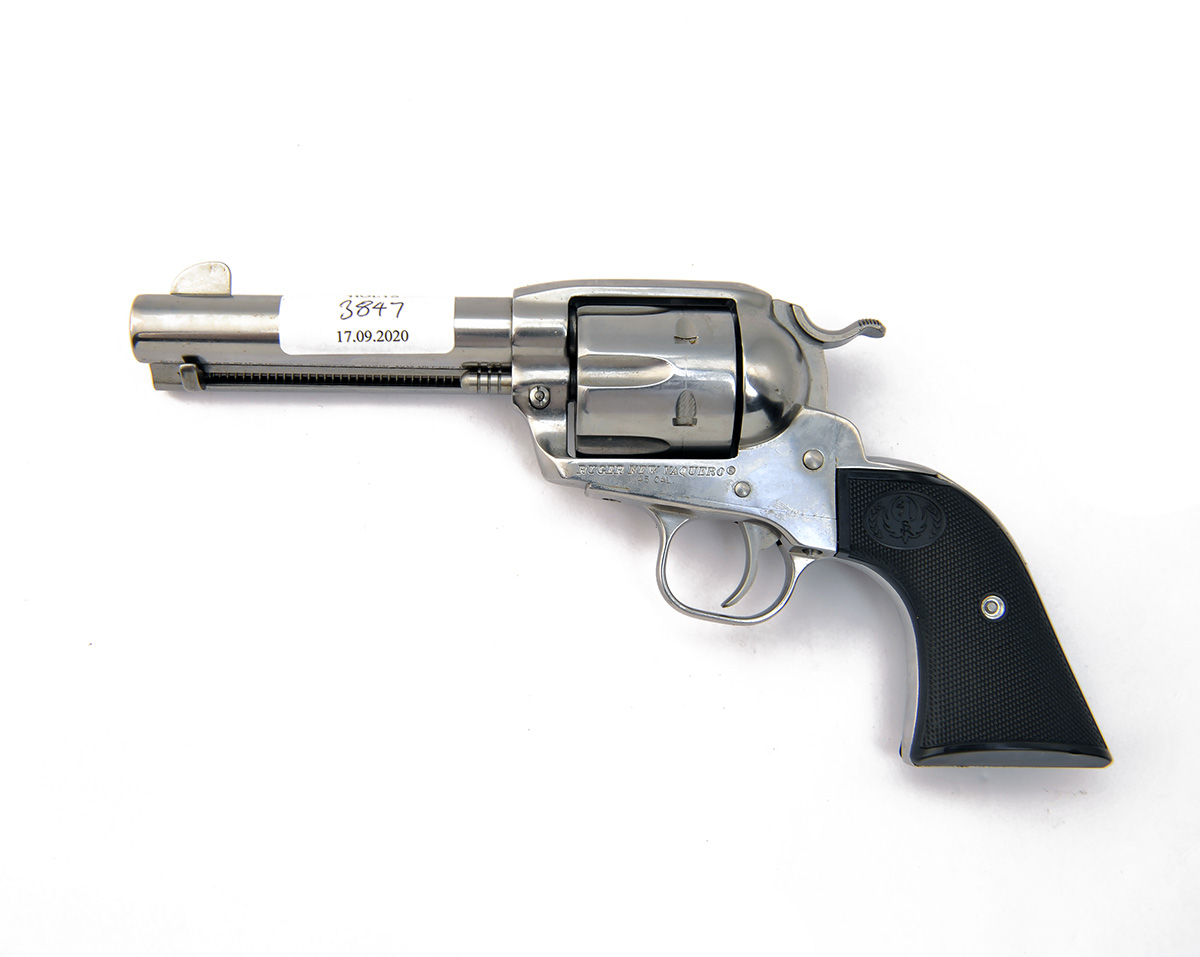 A BOXED .45 (L/C) SINGLE-ACTION STAINLESS REVOLVER SIGNED RUGER, MODEL 'VAQUERO', serial no. 512-46437, with 4 5/8in. barrel, solid frame currently fitted with a 'Bisley' style hammer (original included), fluted cylinder and chequered black plastic grips, in its maker's abs plastic carton