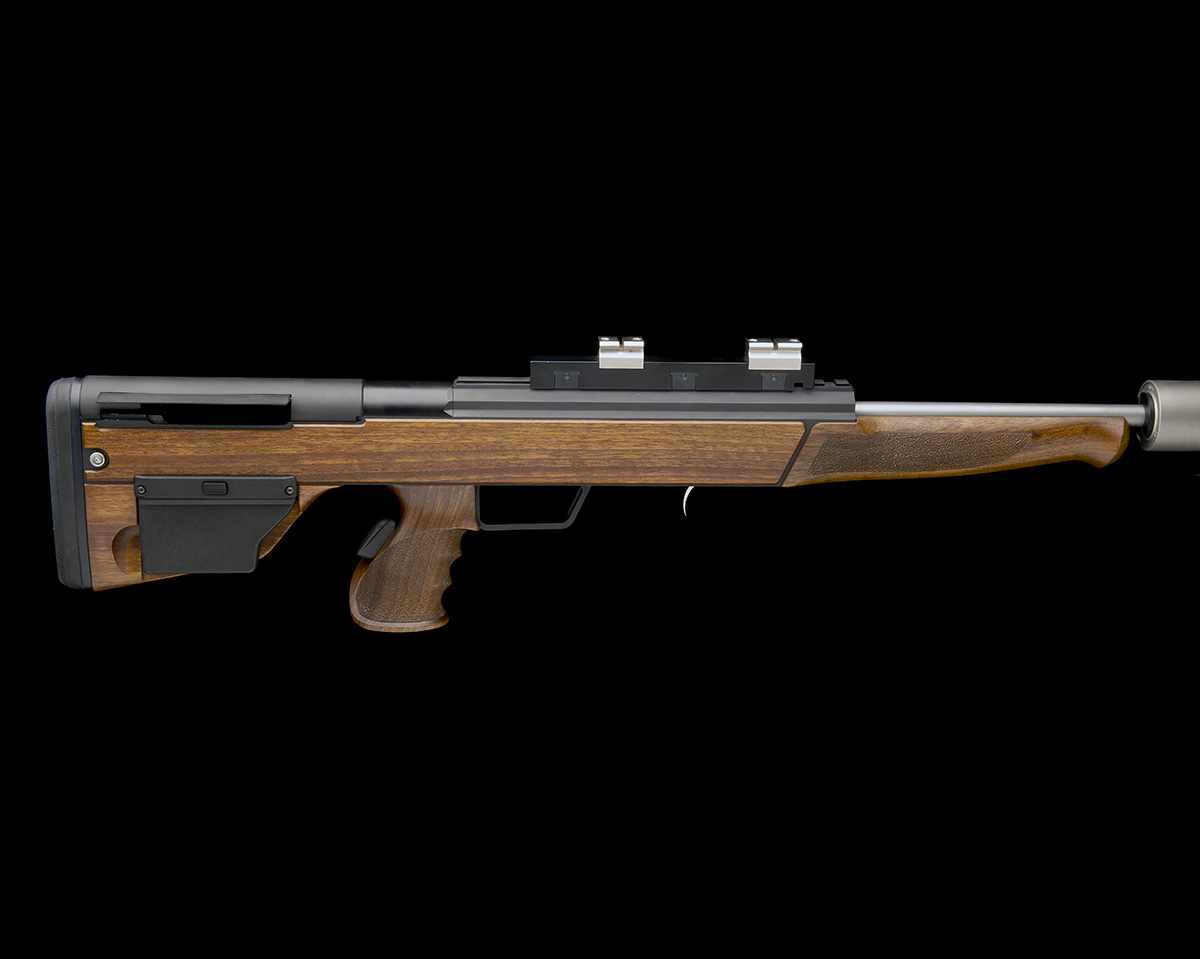 23 1/4in. nitro replacement barrel, fitted with sound moderator, receiver fitted with telescopic sight block mounts, signed 'SOMMER + OCKEOCKENFUß GmbH. .243 WIN.', bifurcated triggerguard, grip-safety with integral bolt-release catch, detachable box magazine wooden side facades, 17in. pull including rubber recoil pad, wooden fore-end, sling swivels, weight 10lb. 5oz. (including sound moderator)