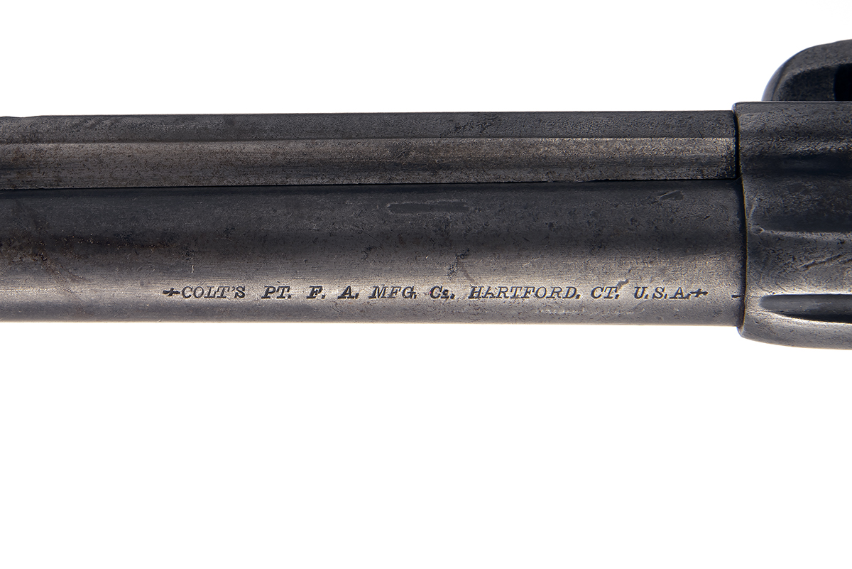 for 1875, with 7 1/2in. barrel, blade fore-sight, single line address, solid frame with two lines of patents and stamped 'U.S', cylinder arbor retaining screw to front of frame, fluted cylinder, iron grip-straps and smooth walnut grips (wear to sharp edges), bullseye ejector, all matching numbers (bar gate), overall length 13 7/8in., minimal traces of finish only