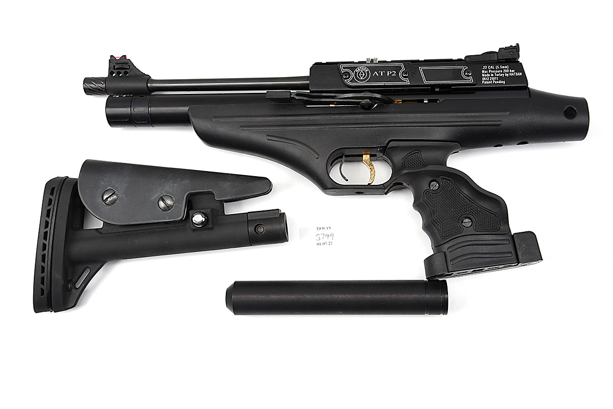 A CASED .22 PRE-CHARGED PNEUMATIC AIR-PISTOL SIGNED HATSAN, MODEL 'AT P2', serial no. 0612-21011, with sighted 10 1/2in. barrel, rotary magazine, side-lever operated mechanism, black soft-touch grip and detachable abs plastic butt-stock, including adaptor, sound moderator and instructions, all in its maker's case, tested
