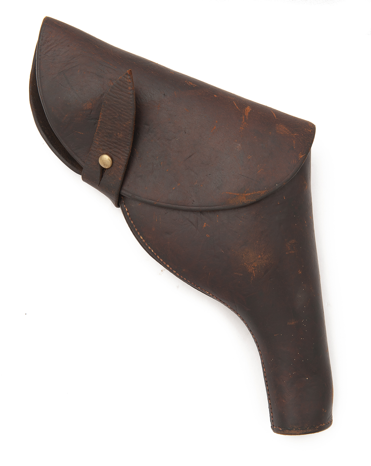 with blued 4in. barrel, integral fore-sight, the top-strap signed 'CHARLES LANCASTER, 151 NEW BOND ST, LONDON', break-open frame with automatic ejecting fluted cylinder and stirrup locking catch, broad hammer spur, double action mechanism and chequered hard rubber birdshead grips, complete with a leather service holster for the same