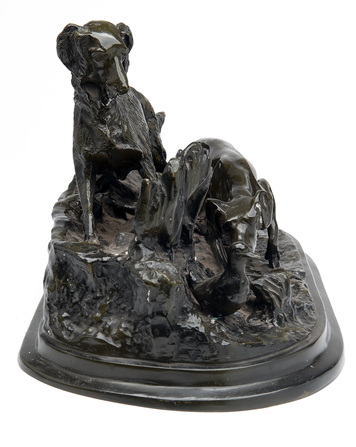 a setter and a pointer flushing a partridge in the undergrowth, measure approx. 18in. x 8in. x 10in., signed P.J. Men (partially obscured)