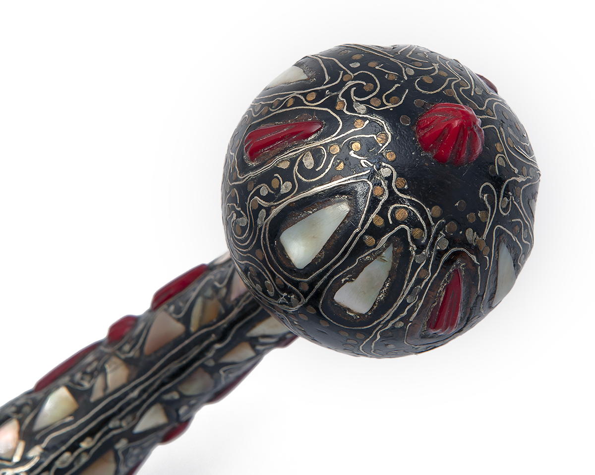 A 20-BORE MIQUELET LOCK RUSSIAN BALL-BUTTED PISTOL, UNSIGNED, no visible serial number made for the tourist market circa 1900, with plain round iron 12 1/2in. barrel, plain lock (does not hold on cock), walnut full-stock with prolific wire, mother of pearl and coral inlays and exposed ball trigger