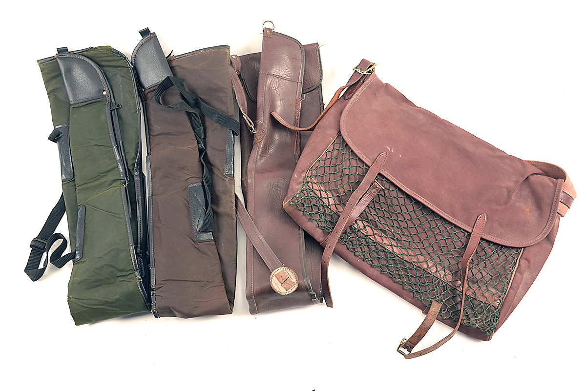 A CANVAS AND LEATHER GAME BAG WITH 3 X SINGLE GUNSLIPS