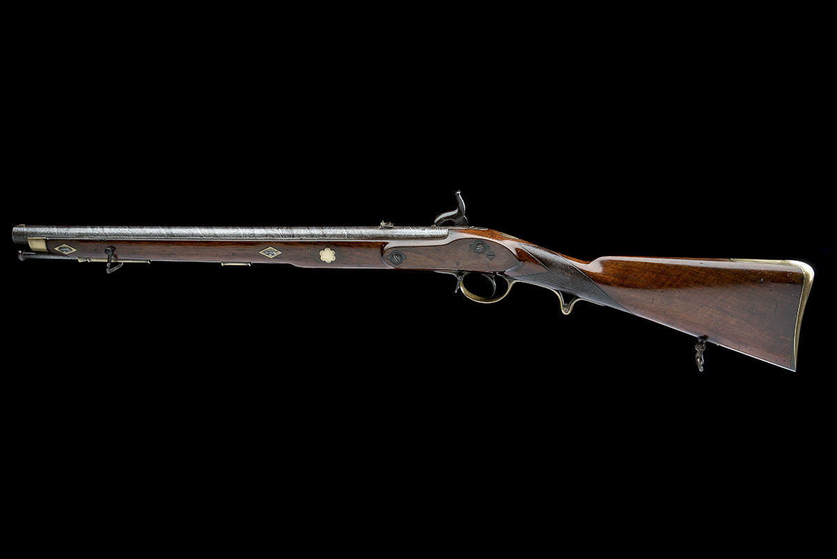 circa 1840 and possibly adapted from an earlier arm or a volunteer type, with 20in. twist-iron round barrel rifled with seven grooves of Baker style, applied fore-sight (rubbed flat), rear-sight of one standing and two folding leaves, solid borderline engraved top-tang with rounded tip, plain borderline engraved bar-action lock of military style, walnut full-stock chequered at the wrist, borderline engraved patchbox to right hand side of butt with 'broken arch' hinge, borderline engraved brass furniture including raised pistol-grip spur and diamond shaped cross-key escutcheons, provision for saddle-bar (removed, holes blanked with screws or period escutcheons, iron swivels and iron button-head ramrod, 35 3/4in. overall