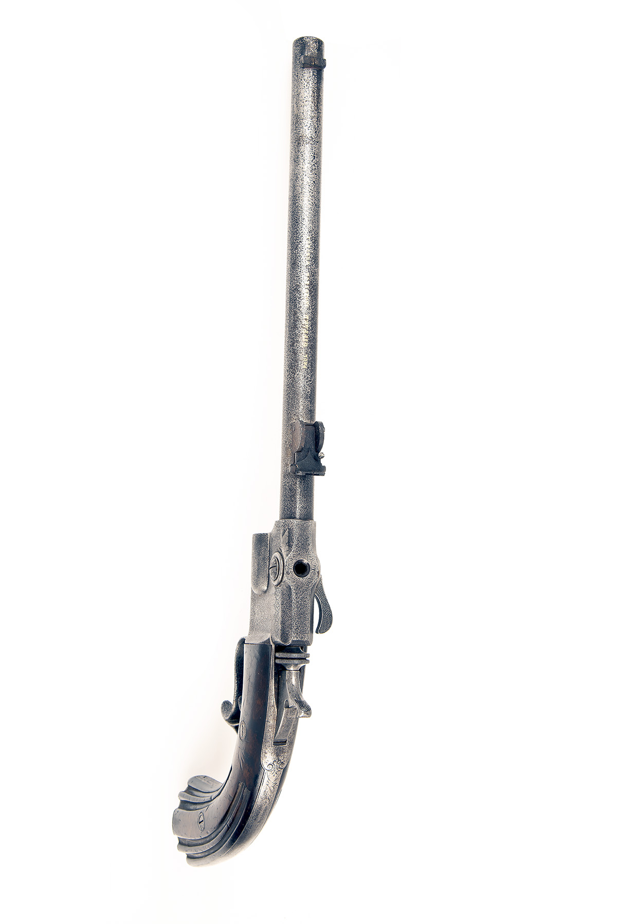 circa 1880, with round 10 1/2in. barrel signed in gilt 'PAUL GIFFARD INVENTEUR BREVETS', dove-tailed blade fore-sight, adjustable tangent rear-sight, provision for CO2 reservoir cylinder beneath the barrel (absent), action engraved with scrollwork, lever-action tap with circular breech for ball, central exposed hammer, walnut fluted grips (some shrinkage), borderline engraved grip-strap, moulded iron spire pommel-cap, iron trigger-guard with finger-spur and adjustable trigger, the whole shallow frosted with some slightly deeper pitting throughout, 18in. overall, weight approximately 2 1/2lbs.