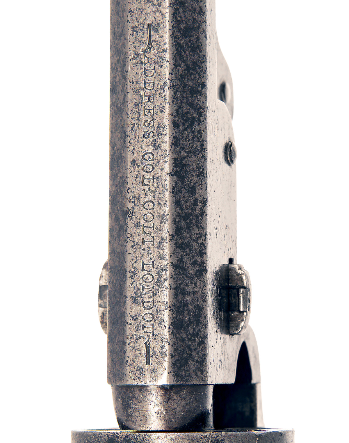 for 1855, with blued octagonal 7 1/2in. London proved barrel, the top-flat signed 'ADDRESS COL. COLT LONDON', six-shot cylinder with roll-engraved naval scene, open iron frame marked 'COLTS PATENT', iron grip-straps and trigger-guard, smooth walnut one-piece grip and articulated under-barrel rammer, dome-head screws, the whole retaining traces of finish (some frosting), all matching numbers, 13 3/4in. overall, weight approximately 2 1/2lbs.
