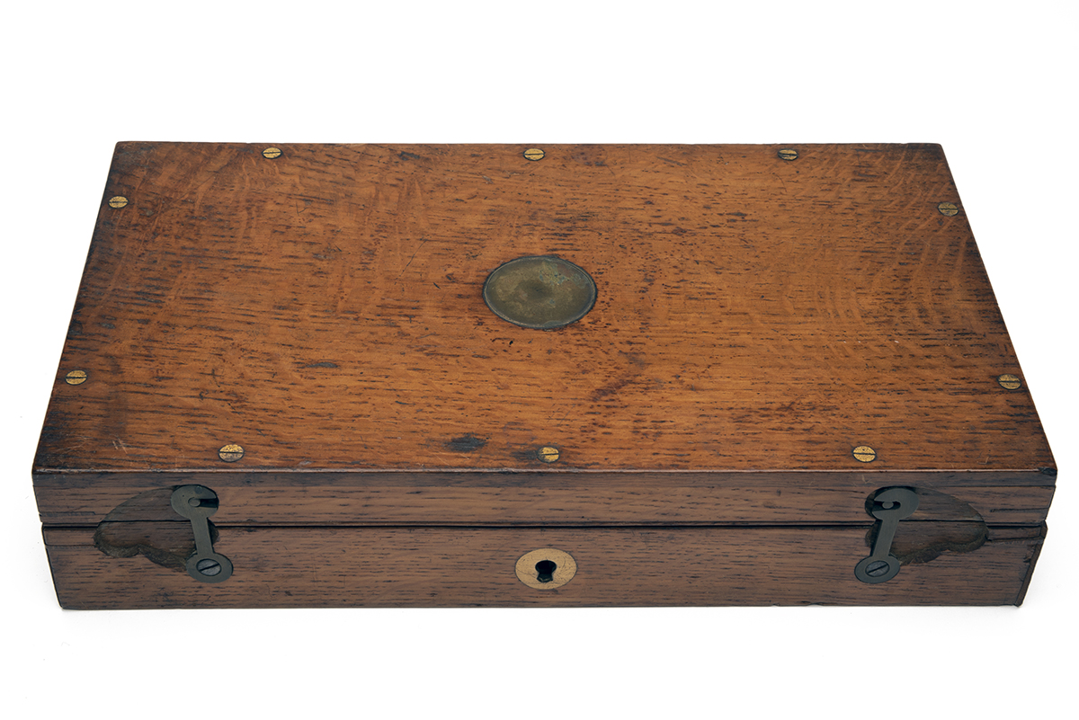circa 1880 almost certainly for a MK4 Pryse-type .450 revolver, lined and compartmented in blue baize (small losses) and retaining a 6in. brass cleaning rod and ebony handled turn-screw, fitted with a cartridge tray for 25 rounds, measuring externally 11 3/4in. x 6 5/8in. x 2 3/8in., ten-screw lid with circular brass escutcheon, hook and lock closure, missing key