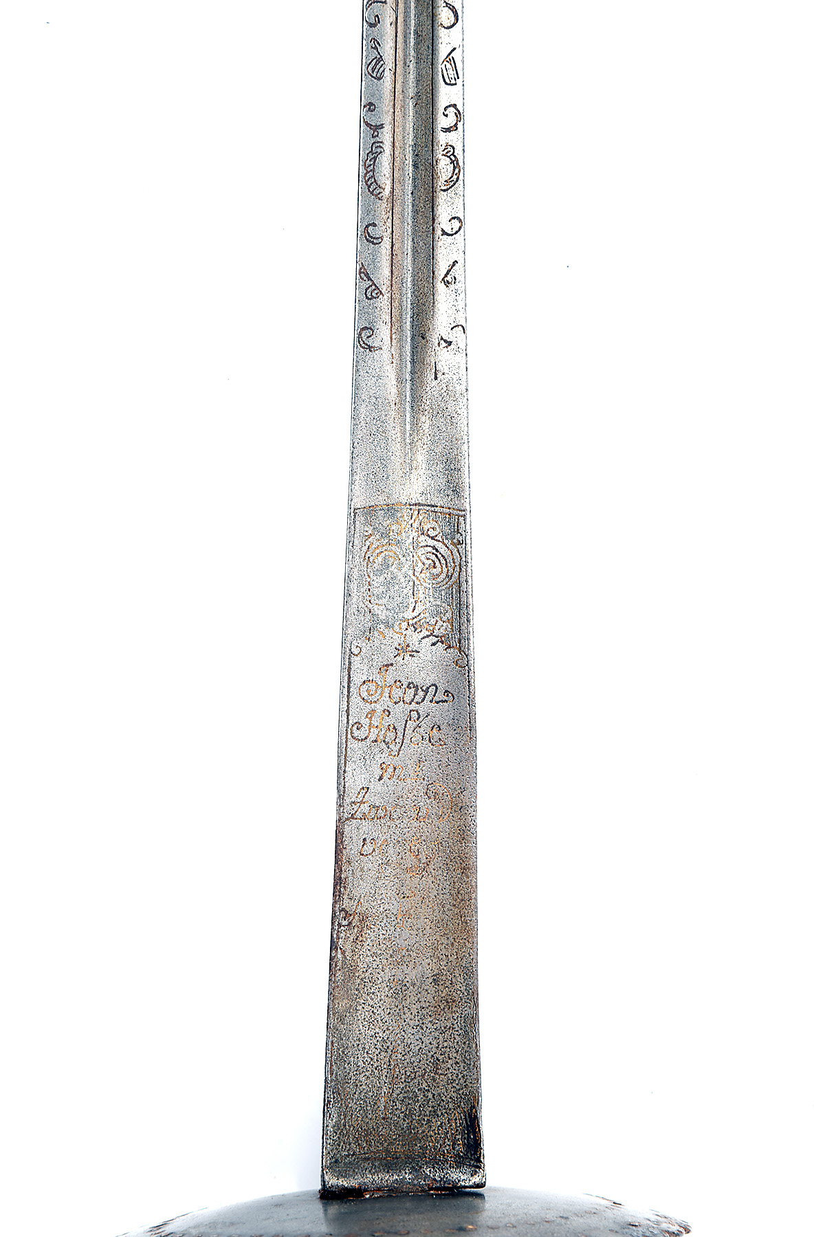 A CONTINENTAL SMALL SWORD 18th Century, with 29in. triangular blade with worn engraved blade including faint maker's details 'LEON / HO...', raised decoration on guard, finger-rings, swollen grip, earn pommel, worn with light rusting, 36in. overall