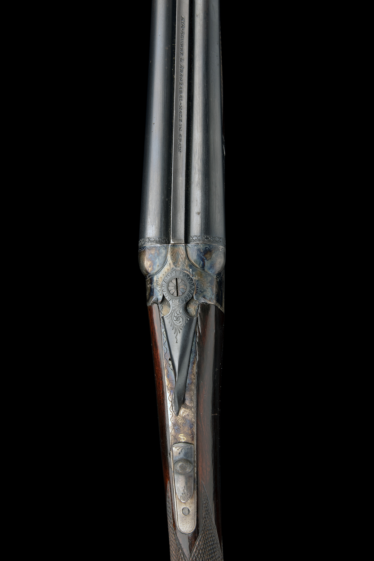 circa 1984, 27in. nitro barrels, 3in. chambers, bored approx. 1/4 and full choke, automatic safety, removable striker discs, border and partial scroll engraving, retaining much original colour-hardening and finish, 13 1/2in. stock, weight 5lb., in a Brady vinyl case