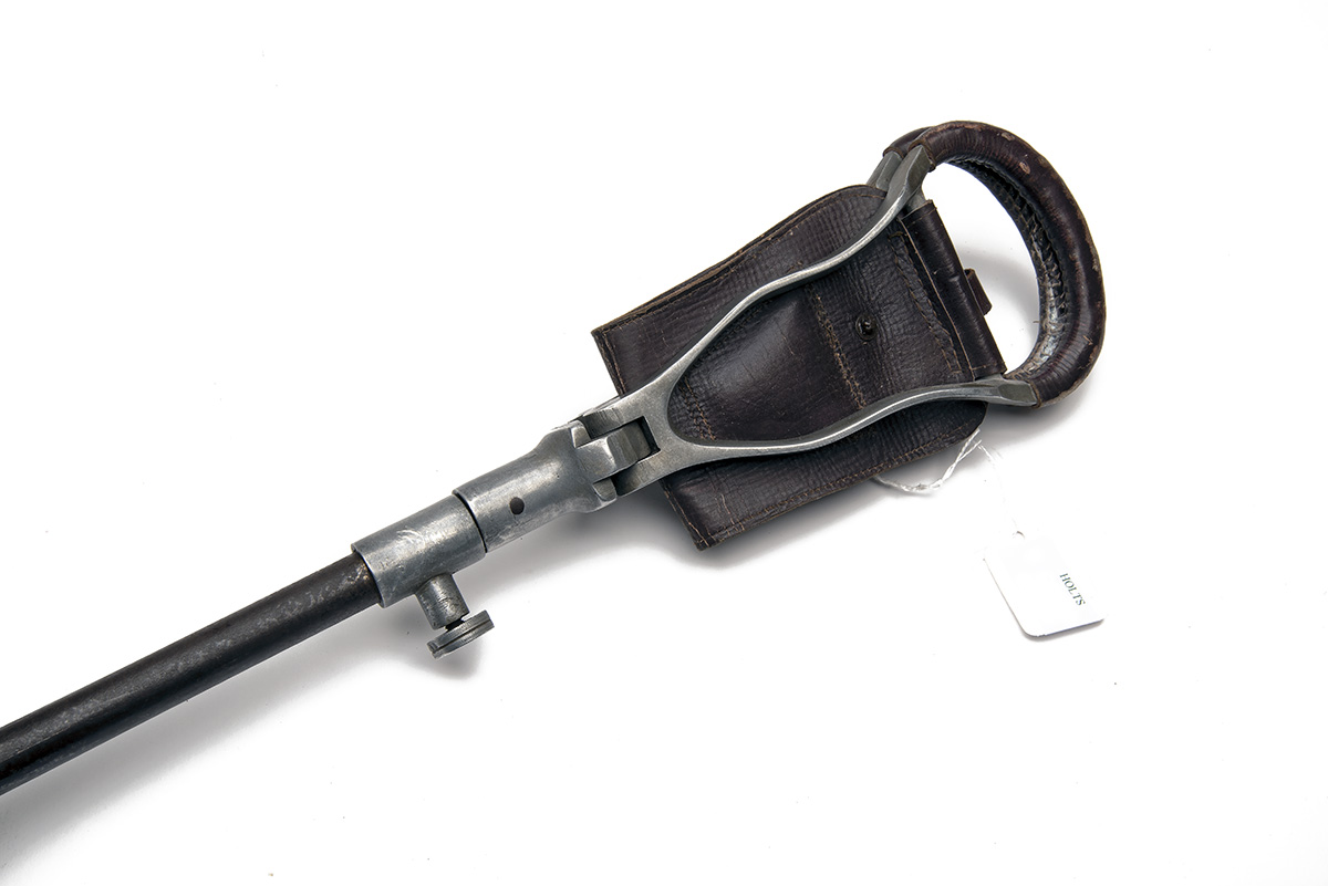 A VINTAGE JAMES PATERSON SHOOTING STICK/SEAT, with adjustable stem, leather seat, leather-bound handles