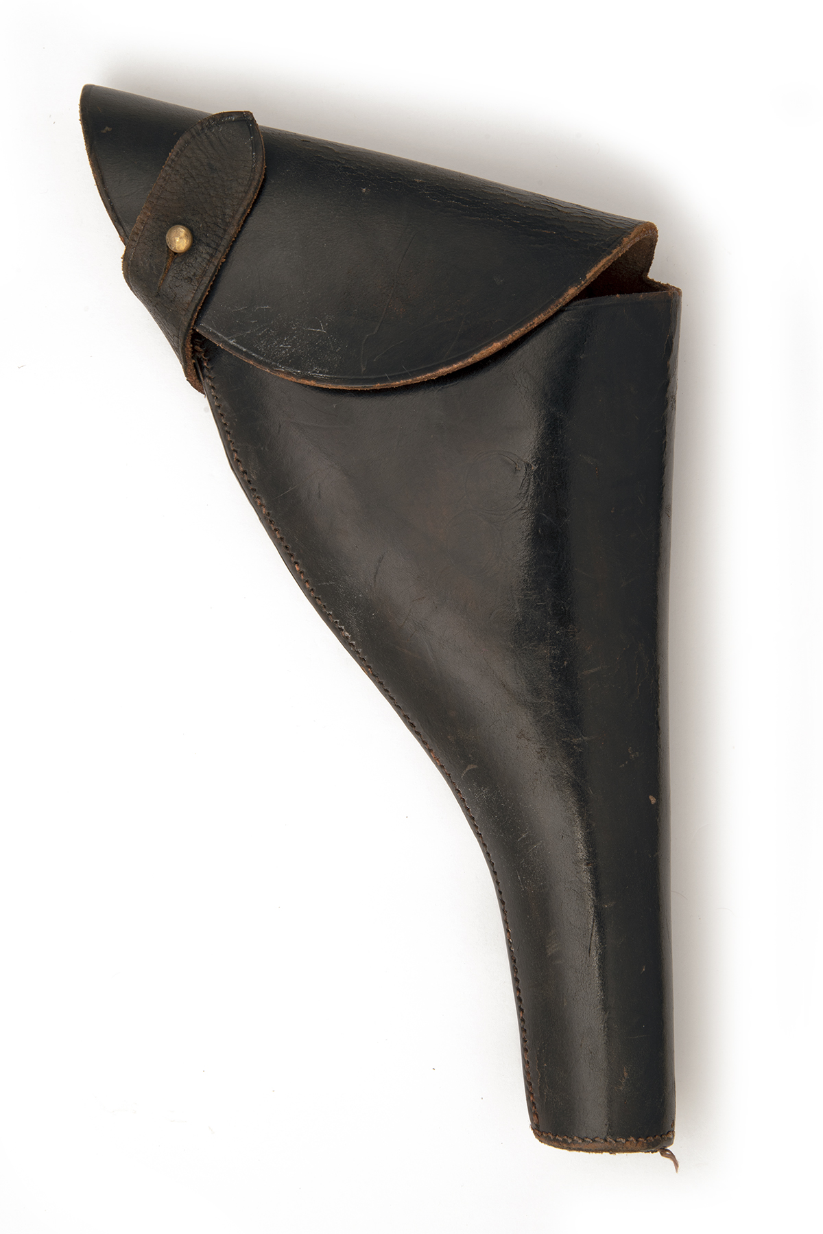 for 1915, with blued 5 1/2in. barrel, solid frame with swing-out auto-ejecting fluted cylinder, the right hand side of frame inscribed 'C.B. NEWTON 7TH YORK & LANC. R.', double action mechanism and replacement chequered hard rubber square-based grips, the whole retaining much of an older refinish, 12in. overall, complete with a period full-flap leather holster