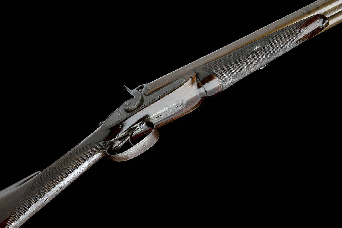 circa 1870, 30in. nitro reproved damascus barrels, the rib engraved 'PATENT. WESTLEY RICHARDS. 170 NEW BOND ST. LONDON.', 2 3/4in. chambers, bored approx. true cyl. in both, Westley Richards patent toplever, non-rebounding sidelocks with dolphin hammers of pinfire form, bar-in-wood, the fore-end meeting at the knuckle in a crab joint, border and partial scroll engraving, 14 1/2in. stock with 1/2in. wooden extension and steel buttplate, fore-end with crosspin release and sculpted horn finial, weight 7lb. 1oz.