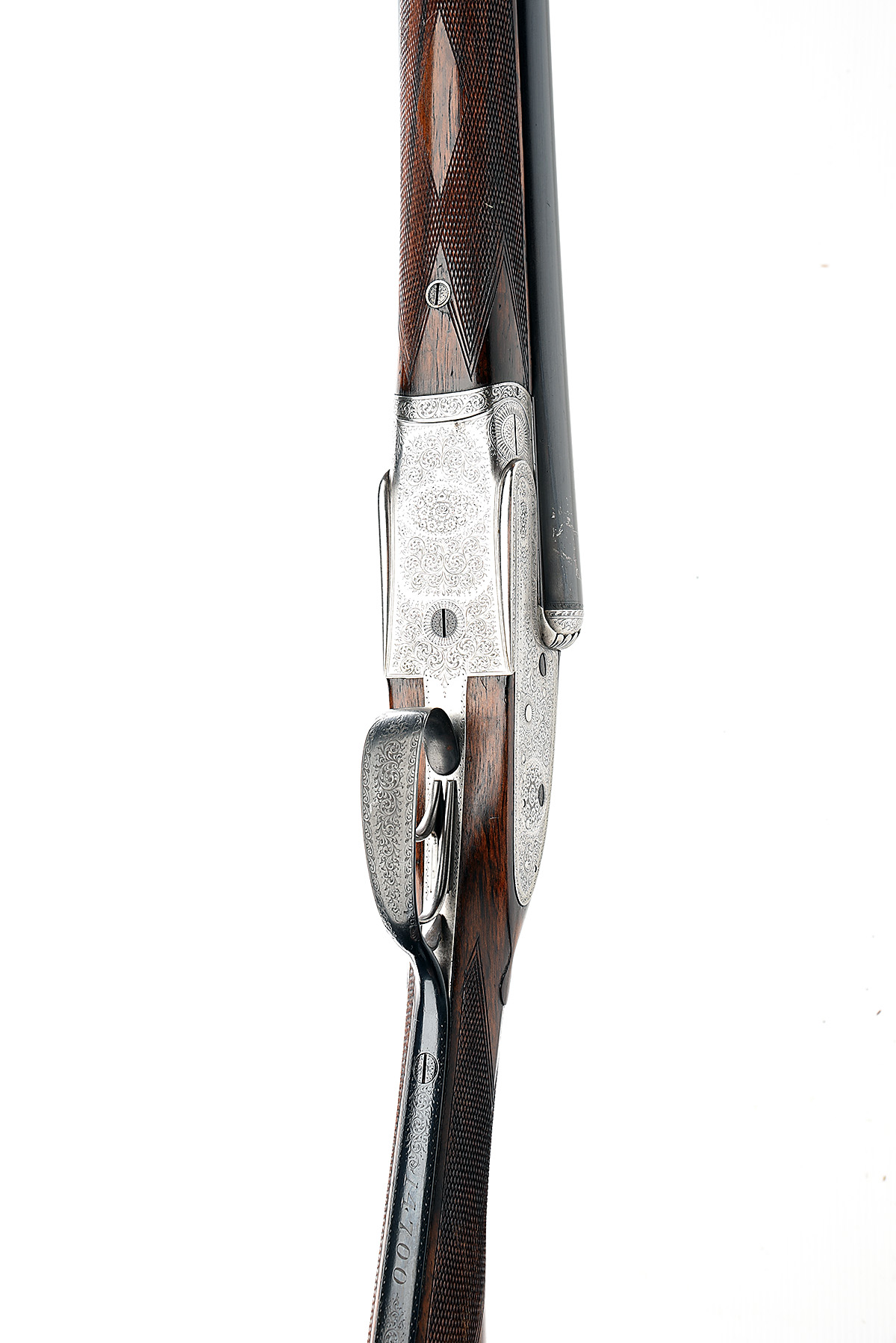 ARMY & NAVY C.S.L. 12-BORE SIDELOCK EJECTOR, serial no. 14700, circa 1897, 29 3/4in. nitro reproved blacked damascus barrels, rib engraved 'ARMY & NAVY C.S.L.', 2 3/4in. chambers, bored approx. 1/4 and full choke, wall thicknesses at 16- and 15, treble-grip action with carved leaf fences, automatic safety with blue enamelled 'SAFE' detail, fine acanthus scroll engraving with floral bouquets, brushed bright and reblued finish overall, 14 1/2in. boldly-figured stock including buttplate, weight 6lb. 7oz.