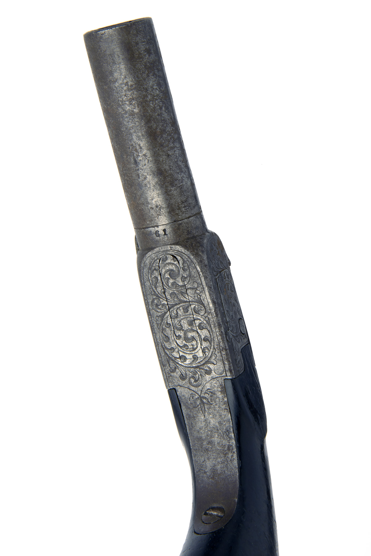 Belgian, circa 1840, with frozen turn-off round 2in. barrel, engraved boxlock action with offset central hammer and automatic trigger (does not hold on cock), walnut bag-shaped butt