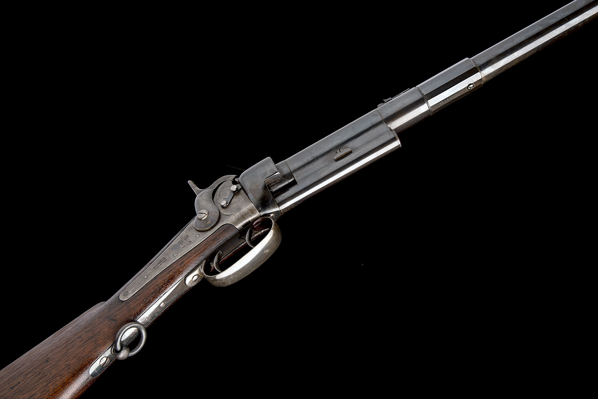 dated for 1856, with blued tapering round 18in. barrel, dove-tailed block and blade fore-sight, elevating ladder rear-sight, central section of outer barrel faceted for grip, plain receiver, long plain top-tang marked 'GREENE'S PATENT JUNE 27 1854', back-action lockplate fitted with 'Maynard's' tape priming system and marked 'MASS. ARMS CO. CHICOPEE FALLS USA 1856' a 'VR' crown cypher and 'MAYNARD'S PATENT SEPT 22 1845', plain hammer, walnut butt-stock (repair at head) with iron patch-box and semi-crescent heel-plate, saddle-ring to the trigger-guard tang, large trigger-guard bow with two triggers, the front one unlocking the barrel for loading, ordnance stamps and no provision for fore-end, the whole an older refinish with much remaining, overall length 34 1/2in., weight approximately 7lbs.