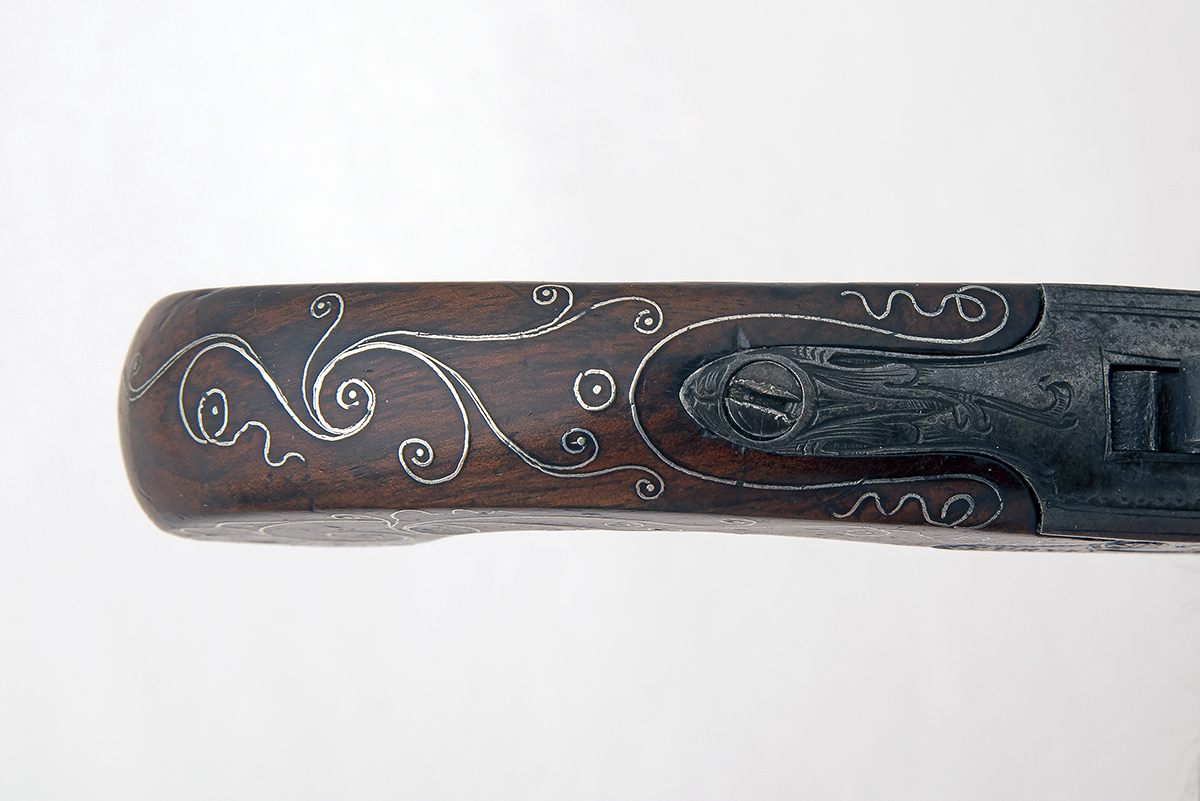 circa 1795, with tapering and banded turn-off 2 1/8in. iron barrel (frozen), London proofs and maker's mark to underside of breech, radiused border and feathered scroll engraved action signed 'TURVEY' to lower edge of right hand side, central swan-necked cock, slab-sided walnut butt with white-metal wire inlays and sliding trigger guard bow safe, 7 1/2in. overall, weight approximately 3/8lb.
