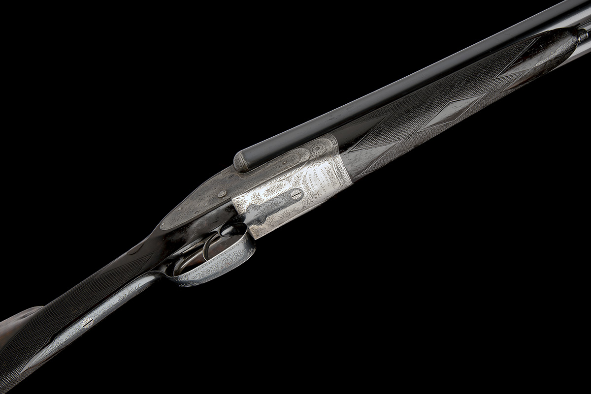 dated 1890, 29in. nitro reproved barrels, rib engraved 'HOLLAND & HOLLAND. 98 NEW BOND STREET. LONDON.', 2 1/2in. chambers, bored approx. true cyl. in both, H. Holland and J. Robertson patent barrel cocking action, patent no. 23 of 1883, action face with W.M. Scott and T. Baker patent 'gas check' gas vents, patent no. 617 of 1882, use number 4256, automatic safety with gold-inlaid 'SAFE' detail, dipped-edge lockplates, protruding tumbler pivots, best fine border and acanthus scroll engraving, the underside engraved '"THE ROYAL PATENT SAFETY HAMMERLESS"', the toplever engraved 'HOLLAND & HOLLAND PATENT NO. 23', retaining traces of colour-hardening and renewed finish, 14 3/8in. tiger stripe figured stock including buttplate, weight 6lb. 11oz., in a case