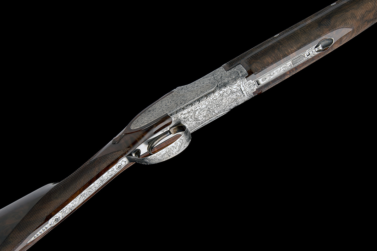 serial numbered to 1953, 26 1/2in. nitro barrels with 6mm ventilated matt top-rib, 2 3/4in. chambers, bored approx. 1/2 and imp. cyl. choke, one-piece fore-end effectively decorated to give the appearance of a three-piece, hold-open toplever, manual safety with gold-inlaid 'O', 'U', and 'S' details, the action, decorative sideplates and furniture finely engraved with bold acanthus motifs, the triggerplate signed 'P. JACOBY', bright finish overall, 15in. well-figured stock, weight 6lb. 11oz., in a Browning universal case