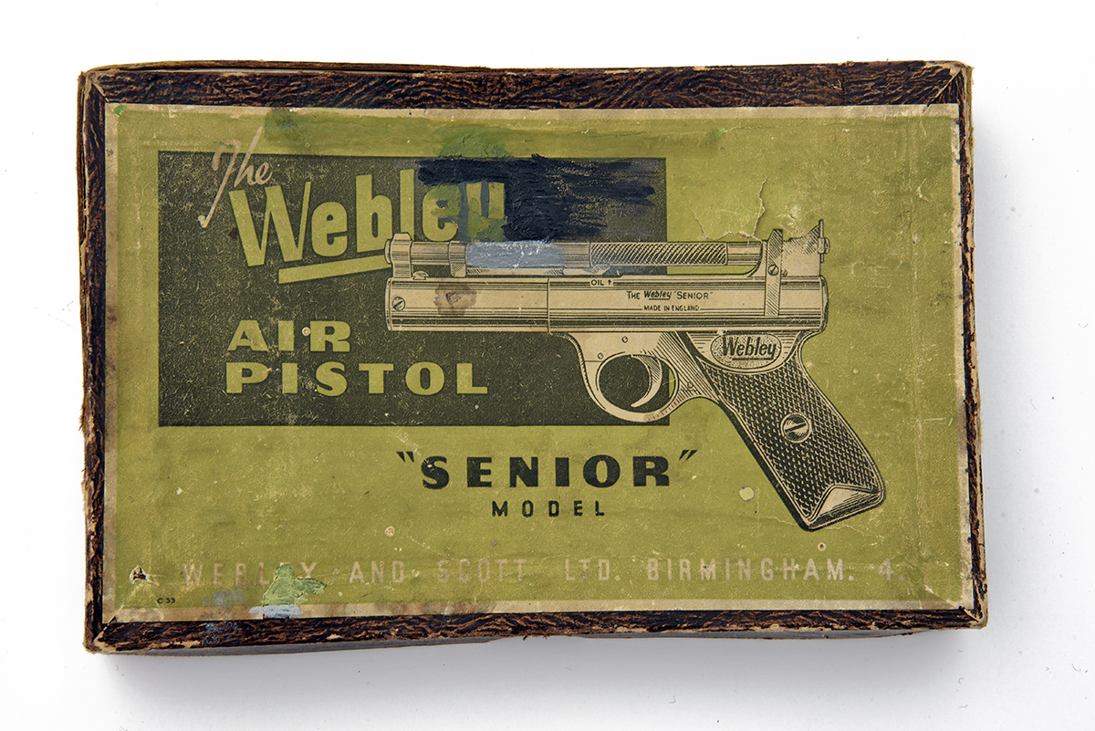 A BOXED .22 & .177 BARREL COCKING AIR-PISTOL SIGNED WEBLEY & SCOTT, MODEL 'SENIOR', batch no. 552, circa 1959, with blued 6 5/8in. barrel, blued stepped air-chamber. brown chequered bakelite grips, appearing little used complete with a spare barrel and original pellet sample envelope in its maker's green labelled carton (repaired)