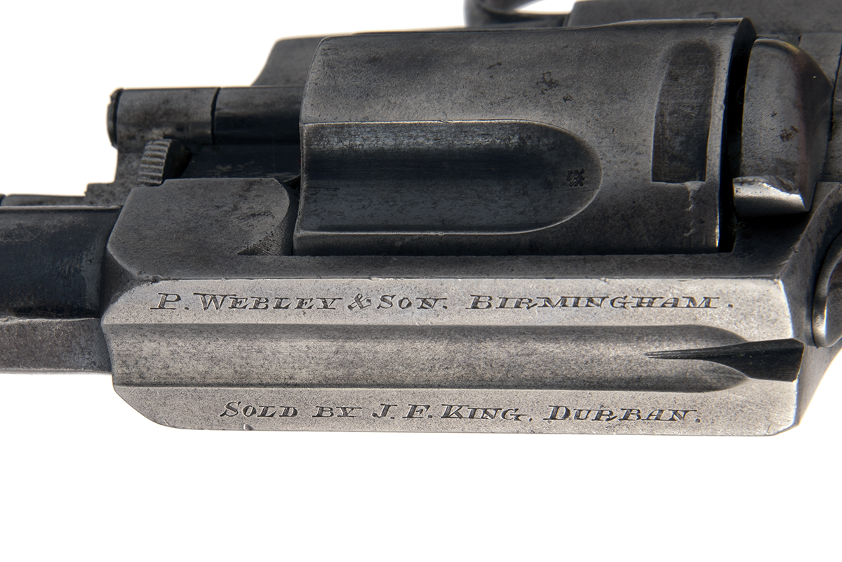 circa 1900, with ovoid 2 1/2in. barrel, the broad sighting grooved top-strap signed 'P. WEBLEY & SON, BIRMINGHAM' and 'SOLD BY J.F. KING, DURBAN', solid stepped frame with gate-loading fluted cylinder, double action mechanism and chequered semi bag-shaped walnut grip with lanyard ring at heel, retaining traces only of original finish, 8in. overall
