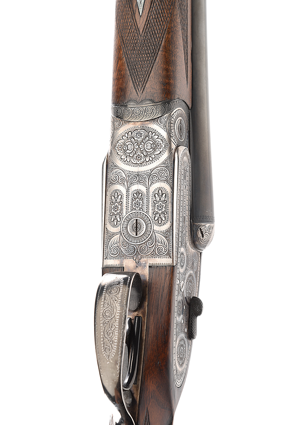 LAURONA 12-BORE HAND-DETACHABLE SIDELOCK EJECTOR, serial no. 147092, dated 1963, 26 1/4in. nitro barrels with Churchill-style matt rib, 2 3/4in. chambers, bored approx. imp. cyl. and 1/4 choke, treble-grip action with hidden third-bite, automatic safety with engraved 'S' detail, removable striker discs, hand-detachable lock-plates, cocking indicators, articulated front trigger, border, scroll and floral bouquet engraving, retaining some original colour-hardening and finish, 15in. stock including ventilated rubber recoil pad, weight 6lb. 7oz., in a fleece-lined leather slip