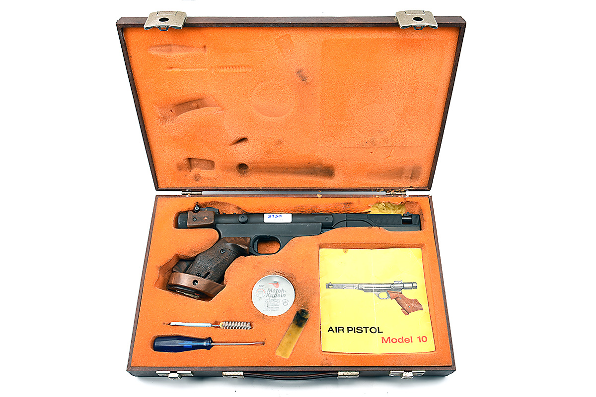 A CASED .177 BREAK-BARREL RECOILLESS AIR-PISTOL SIGNED ORIGINAL, MODEL '10', serial no. 07950, circa 1978, with grey phosphated breech and blued 7in. barrel, rotating cocking shroud, phosphated air-chamber, micro adjustable sights, walnut anatomical grip and match trigger (may require new washers), TOGETHER WITH its makers carry case, tools and instructions