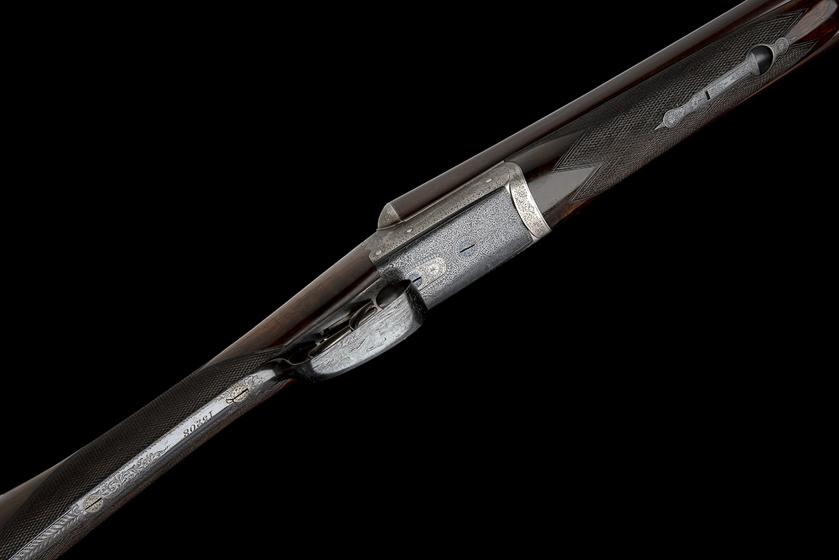 circa 1895, 30in. nitro reproved fine damascus barrels, the rib engraved 'WESTLEY RICHARDS. 170. NEW BOND ST. LONDON.', and '1' at the breech end, 2 1/2in. chambers, the extractors individually serial numbered, bored approx. true cyl. choke in both, scroll-back treble-grip action, Westley Richards patent toplevers engraved 'WESTLEY RICHARDS PATENT EJECTOR' and '1', automatic safety with gold-inlaid 'SAFE' detail, the action flats marked with ANSON & DEELEY'S PATENT' use number 13491, and 'DEELEY'S PATENT EJECTOR' use number 4883 (for Deeley patent ejector No. 4289 of 26th March 1886), fine acanthus scroll engraving with ornate bordering, retaining very slight traces of colour-hardening and finish, the triggerguard with a small game scene of a hare darting, 14 3/4in. figured stock, fore-end with Deeley & Edge patent release catch and horn finial, weight 6lb. 7oz.