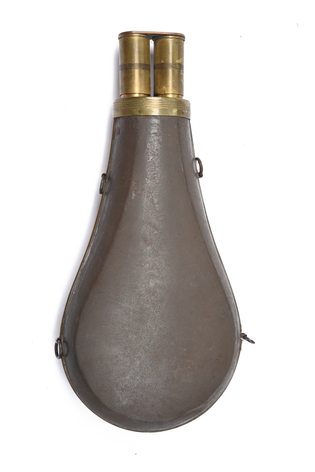 A MOST UNUSUAL TIN-BODIED TWIN-NOZZLE POWDER-FLASK TOGETHER WITH A DOUBLE LEATHER SHOT-BELT, the first of sporting gun size, with twin brass nozzles and double dispensing cap, the second of Irish form with automatic cut-offs