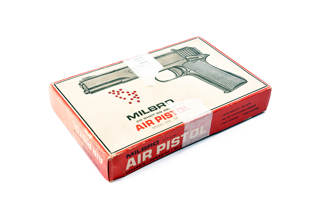 A BOXED .177 BB TOP SLIDE COCKING AIR-PISTOL SIGNED MILBRO, MODEL G10 no visible serial number,