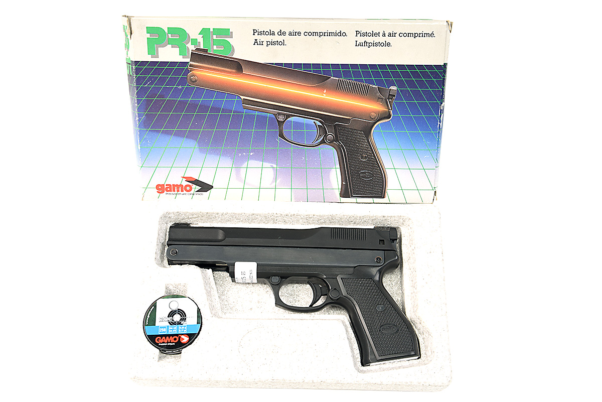 A BOXED .177 BARREL PUMP UP AIR PISTOL SIGNED GAMO MODEL PR-15 Serial no 162069 with a 6.5in barrel, open sights, triggerguard safety, partial blued steel frame, black abs top slide and grips.