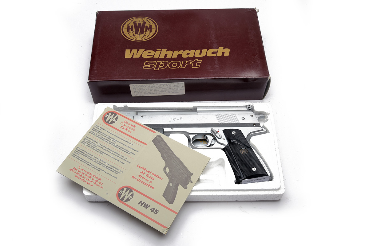 A BOXED .22 BARREL COCKING AIR PISTOL SIGNED WEIHRAUCH MODEL HW45 Serial no 366384 with a 6in. barrel, open sights, satin silver anodised frame and top slide with black Pachmayr grips. In manufacturers original box.