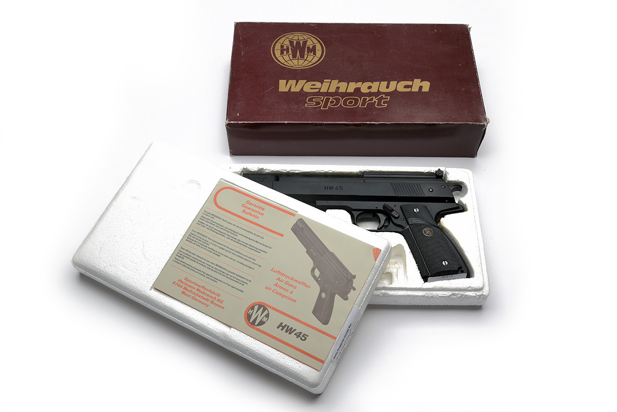 A BOXED .177 BARREL COCKING AIR PISTOL SIGNED WEIHRAUCH MODEL HW45 Serial no 375514
