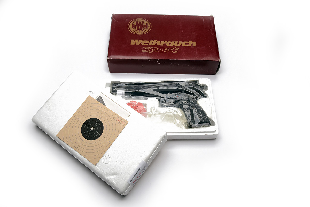 A BOXED .22 BARREL COCKING AIR PISTOL SIGNED WEIHRAUCH MODEL HW45 Serial no 374026