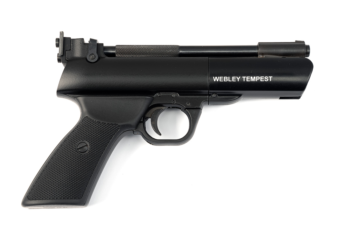 being number 56 of 2000 produced in 2010 to celebrate the 100th anniversary of Webley's first airgun patent of 1910, with 6 7/8in. sighted barrel, stirrup barrel locking latch, adjustable rear-sight, black enamelled receiver with plastic furniture, side mounted safety, chequered black plastic grips, the heel bearing the special serial number and complete with its faux leather storage case lined and compartmented in dark blue baize, the inside of lid embroidered with the Webley 'winged bullet' trademark above '1910-2010, 100 YEARS OF QUALITY AND INNOVATION IN AIRGUNS', together with its instruction handbook and certificate of authenticity and a wire handled cleaning brush, all apparently unused (collection labels applied to case)