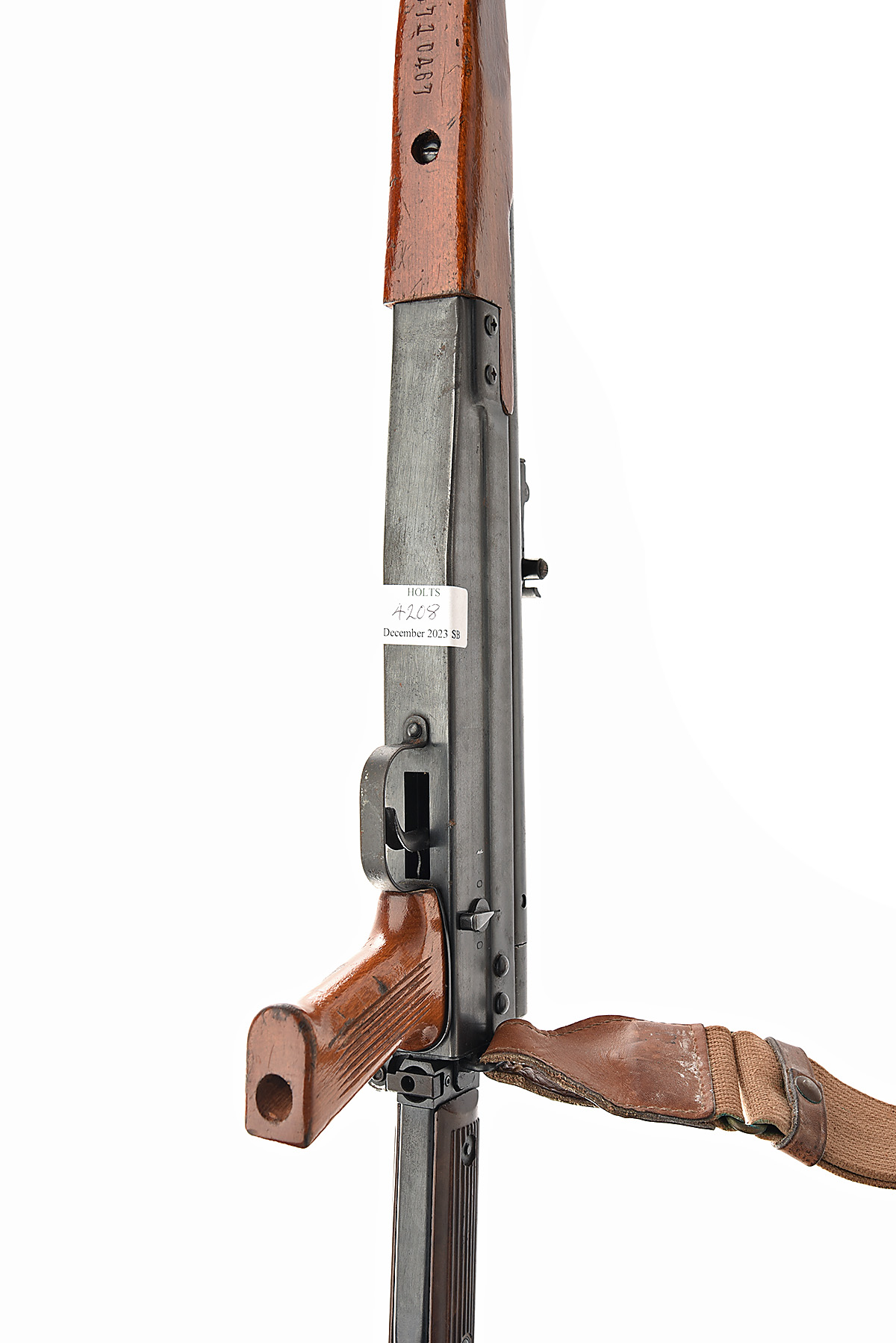 A SCARCE .177 SIDE-LEVER CHINESE LION AIR-RIFLE WITH FOLDING STOCK, serial no. 8710467, loosely styled in imitation of an AK47 type rifle, with 15in. barrel, sliding breech, open sights, no provision for telescopic sight, folding steel skeleton butt with bakelite panels, wood pistol-grip and fore-end, fitted with a canvas sling, generally collector's condition externally