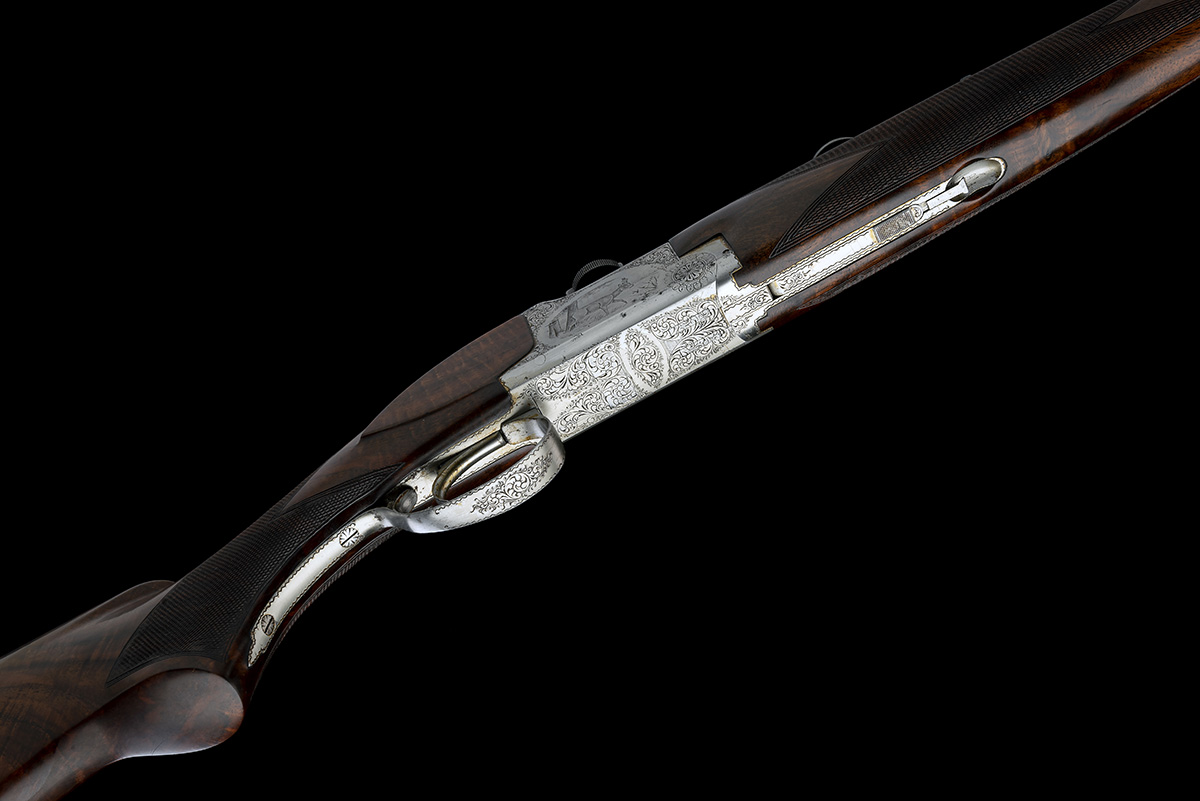 for 2002, 25 3/4in. nitro barrels with raised matt sight-rib, flip-up open sights and ramp-mounted bead fore-sight, the breech end with quickly-detachable telescopic sight mount bases (with rings in case), the over barrel with 'Fabrique Nationale Herstal' and the calibre designation in script, hold-open toplever, manual safety with integral barrel selector switch, acanthus scroll engraving surrounding game scenes of red deer and roe buck, signed 'M. Derwa', bright finish, 14 3/8in. figured pistolgrip stock with sling eyes and including 3/8in. rubber recoil pad, weight 7lb. 13oz., in its universal case with paperwork, including sighting targets and Browning Certificate of Identification and Quality