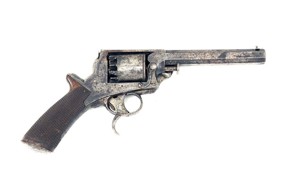 with 5 3/4in. octagonal sighted barrel with engraved band decoration at muzzle, the top flat inscribed with the retailers name 'B. COGSWELL 224 STRAND LONDON', foliate engraved frame inscribed on the right 'NO 13680T' and fitted with Tranter's patent 3rd type lever rammer on the left, one piece chequered walnut grips, contained in its original green baize lined and partitioned oak case, partitions loose, broken and some missing, lining stained, the lid with original and good Cogswell trade label, accessories include a correct Tranter double cavity mould, a good Dixon bag shaped flask, oil bottle and tin of Tranter's Lubricating Bullets, the revolver dirty overall, some finish in protected areas, some speckling