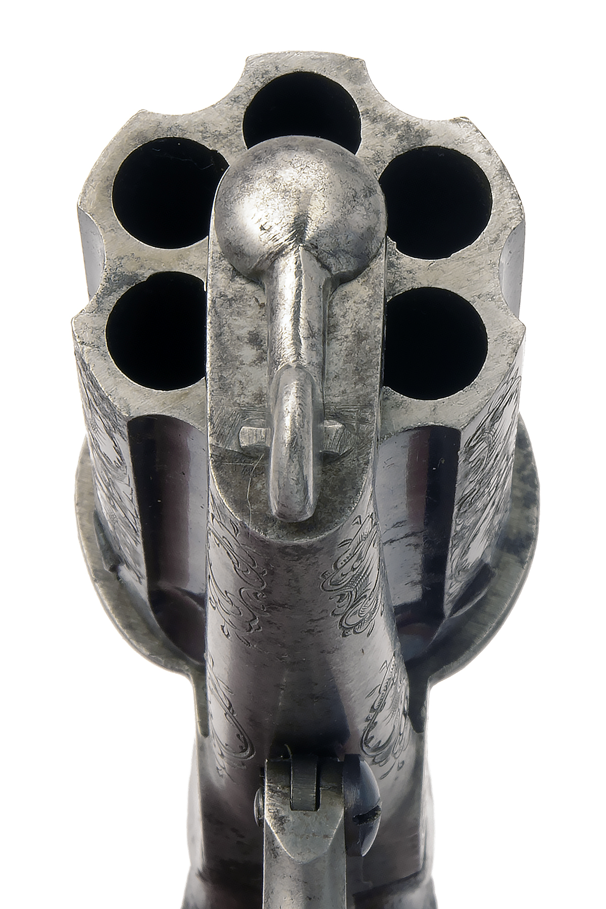 circa 1875, with blued fluted 1 3/4in. barrel-group with scroll engraving over each barrel (traces of possibly later gilt fill to engraving), single groove rifling, open scroll engraved colour hardened frame with wing-nut cylinder arbor, spurless central hammer, chequered walnut bag-shaped grip and folding trigger, much original finish remaining